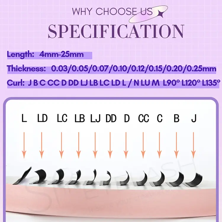 SP Eyelash Lash uzadılması təchizatı, müxtəlif göz formaları və arzu olunan makiyaj effektləri üçün uyğun J, B, C, CC, D, L və M daxil olmaqla geniş çeşidli qıvrım variantları təklif edir. İncə və təbii qıvrımlardan dramatik və cazibədar qıvrımlara qədər hər şey mövcuddur.