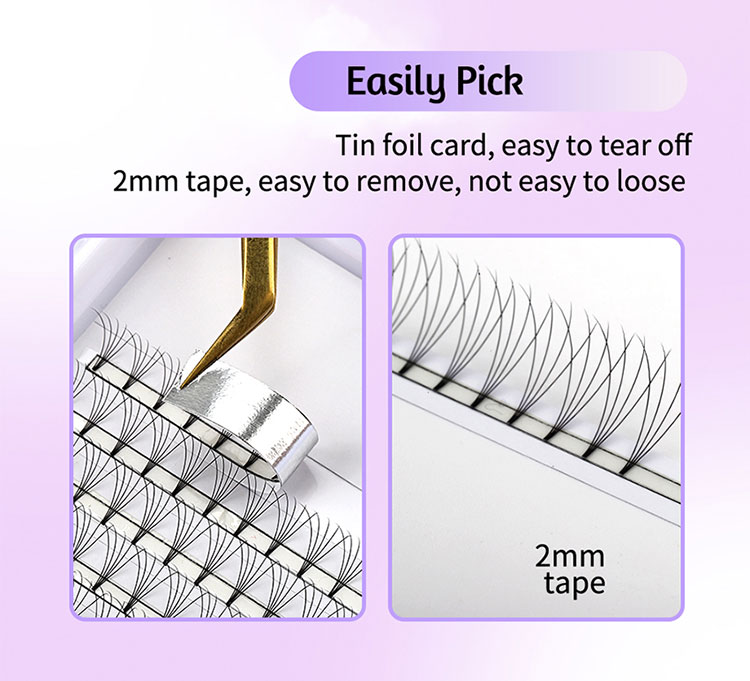 Folqa kartlarında qablaşdırılan bu əvvəlcədən hazırlanmış fanat kirpikləri, əldə etmək asandır. 2 mm lentin açılması asandır, kirpiklər asanlıqla ayrı düşmədən çıxarmaq asandır. Bu rahatlıq, hamar və səmərəli iş axını təmin edərək, kirpik tətbiqetmə prosesini asanlaşdırır.